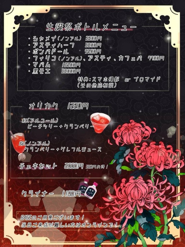 【備考欄にハンドルネーム等どなたかわかるようにご記載お願い致します!】3000円(税抜)のボトルが入れられます。シャメイ(ノンアルコール)、あるいはアスティのハーフボトル(アルコール)となります。